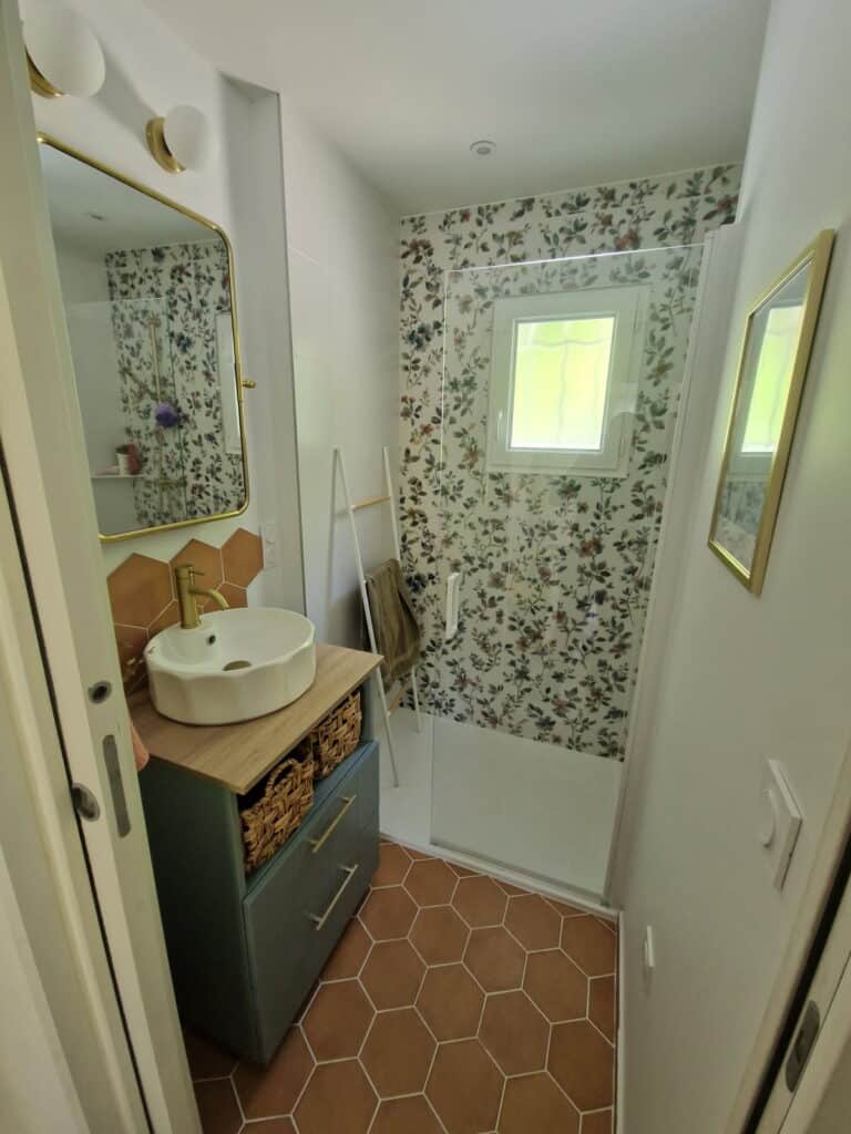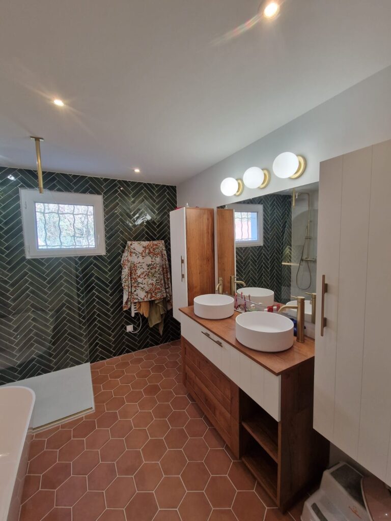 Grand format gris clair sur deux murs pour ancrer la modernité. Faïence « métro » vert foncé posée en chevron sur le mur de douche et dans la niche… ce motif en V crée un point focal saisissant. Hexagonal terre cuite au sol pour apporter cette chaleur contrastée qui fait toute la différence.